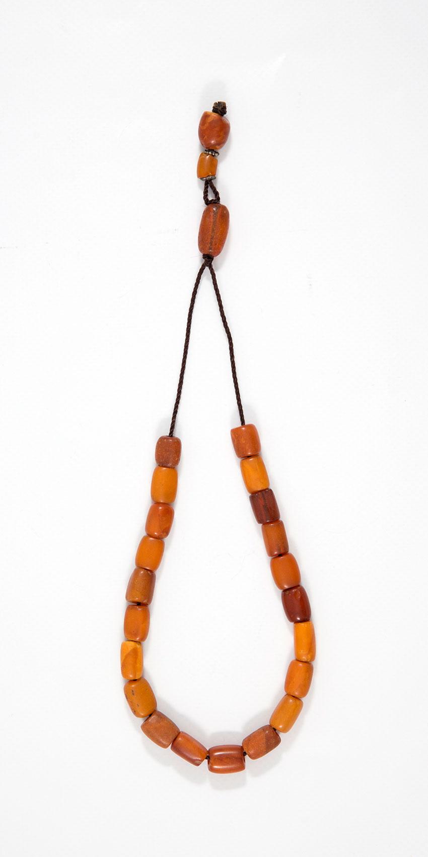 Τα παλιά κομμένα αυτά κεχριμπάρια που βλέπετε προέρχονται από Ήλεκτρον που κόπηκε για να γίνει προσευχητάριο από τον 18ο αιώνα και το τέλος του και τις αρχές του 19ου αιώνα. Είναι πολύ μαλακό (σαν το τσόφλι του αυγού). Είναι για να μετριέται με τρυφερότητα και όχι να «γυρνά βόλτα» (όπως συνηθίζουμε να παίζουμε το κομπολόι μας). Το υλικό διασώθηκε γιατί ποτέ δεν «χτυπιόταν» μια χάντρα επί της άλλης στα προσευχητάρια για να παράξει ήχο αλλά μόνο μετρούμενη.